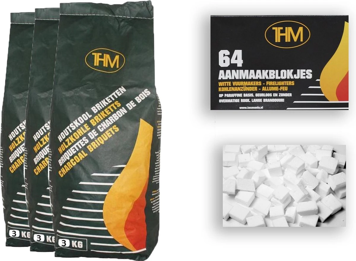 3X briquettes de charbon de bois de 3 KG avec allume-feu 64 Pièces – Barbecue – BBQ – 3 Pièces