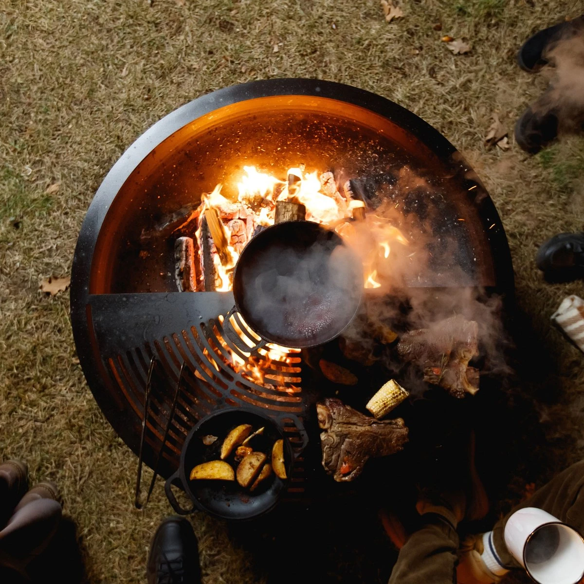 Les bols à feu AHOS sont tous équipés d’un anneau de gril amovible. Cet anneau de gril est fabriqué en acier au carbone de haute qualité d’une épaisseur de 6 mm. Parce que les bords de l’anneau du gril sont pliés vers l’intérieur, l’huile chaude ne s’écoulera pas du plat, mais s’y écoulera. L’anneau du gril est doté d’un revêtement antiadhésif multicouche qui empêche les aliments de coller à l’anneau du gril. De plus, le revêtement antiadhésif prolonge la durée de vie de l’anneau du gril. En plus des options ci-dessus, l’anneau de gril a des trous de convection pour une meilleure répartition de la chaleur, une surface pour une poêle à frire, des fentes pour barbecue et un anneau intégré pour placer une bouilloire. Même lorsque l’anneau du gril est sur le panier à feu, il est possible de mettre du bois de chauffage dans le bol, de sorte que le feu reste allumé. Parce que le bol est au ras du sol, il peut être placé parfaitement entre un groupe de personnes assises, de sorte que les gens se réchauffent lorsqu’il se refroidit à l’extérieur.