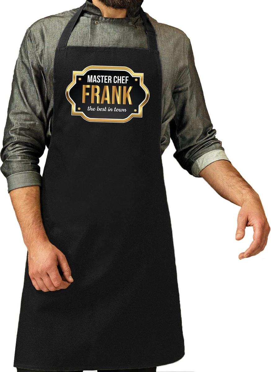 Cadeau prénom tablier de maître chef Frank noir – Cadeau tablier de cuisine. Ce tablier de cuisine / tablier de barbecue a un imprimé en or noir : Master chef Frank – Le meilleur de la ville. Un cadeau original et personnel pour quelqu’un avec le prénom Frank qui sait bien cuisiner ou faire un barbecue, par exemple comme cadeau d’anniversaire / fête des pères / remise des diplômes / retraite / cadeau de remerciement. Matière: 65% polyester / 35% coton. Qualité: 195 grammes. Taille unique. Largeur 72 cm. Longueur 86 cm.