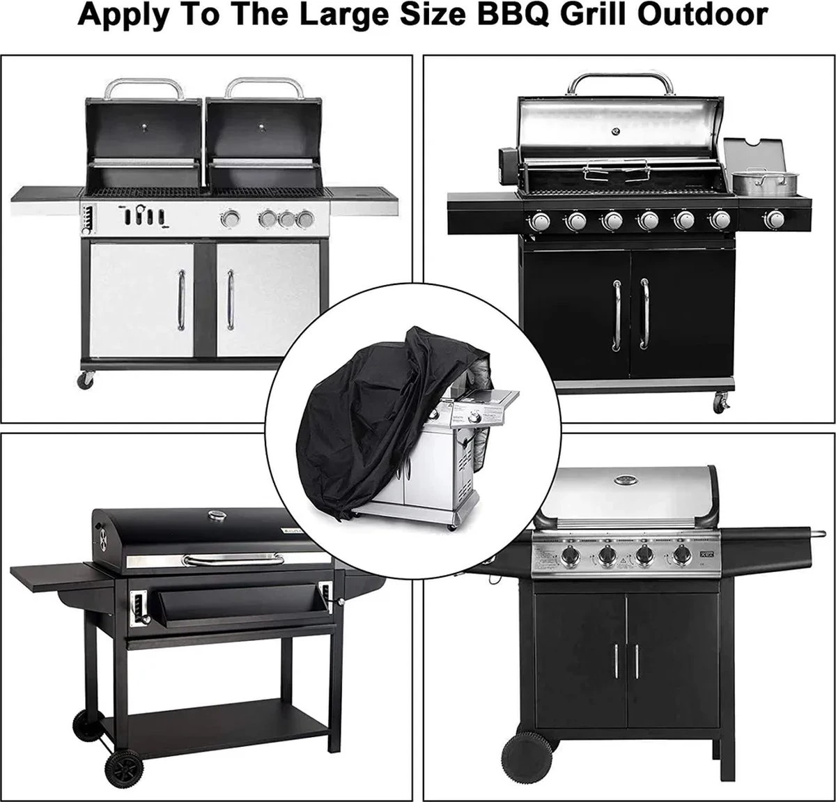 # La housse de BBQ est fabriquée en tissu Oxford 210D de haute qualité, protégeant votre barbecue à gaz contre la grêle, le vent, la chaleur, le froid, les insectes, la pluie ou la neige.