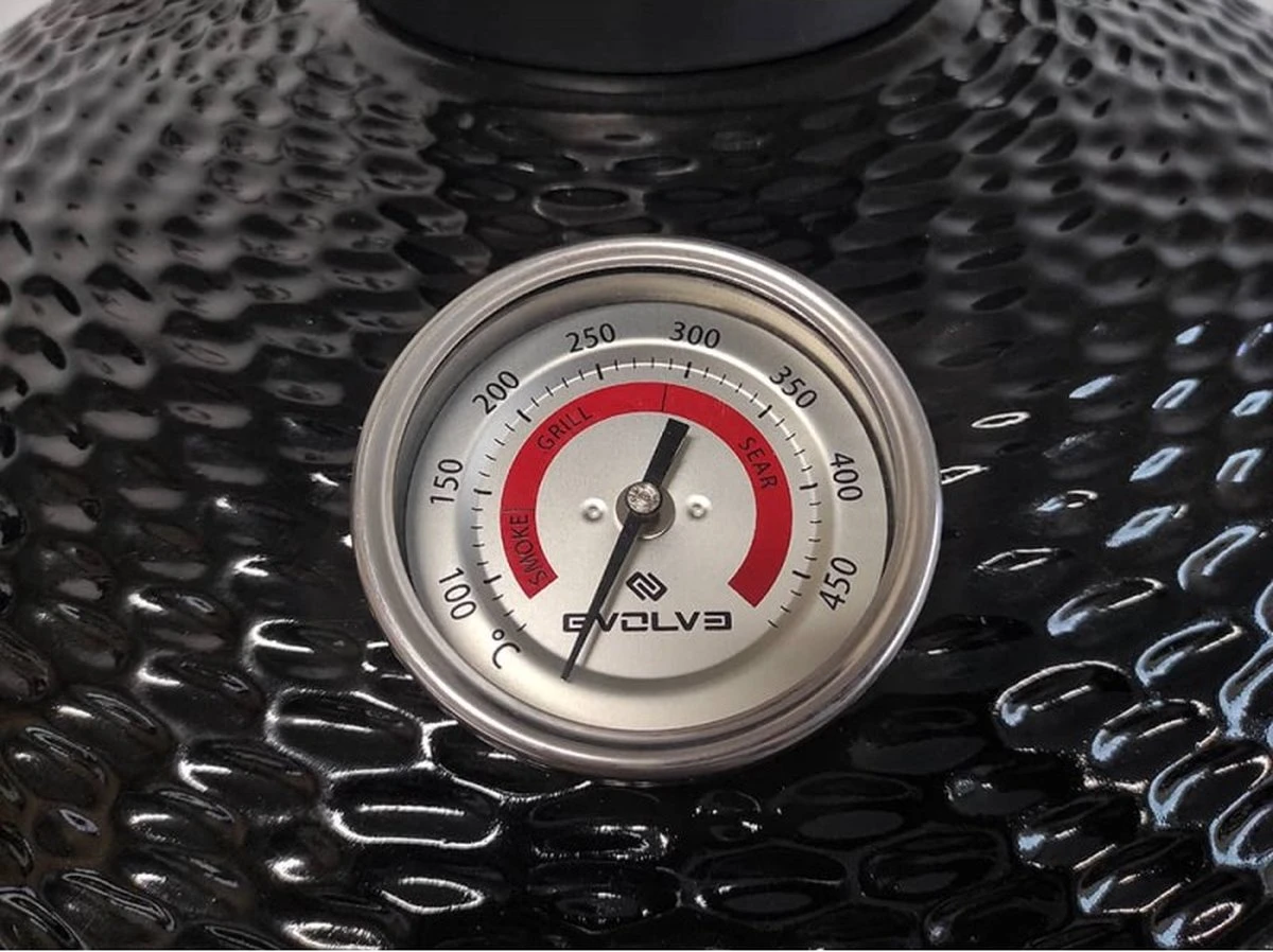 Le thermomètre étanche et antibuée avec une large plage de température et une sonde sensible offre un moyen facile de mesurer avec précision la température interne sans ouvrir le dôme. Le thermomètre est facile à lire et à identifier et affiche même les températures recommandées pour différents types de méthodes de cuisson.