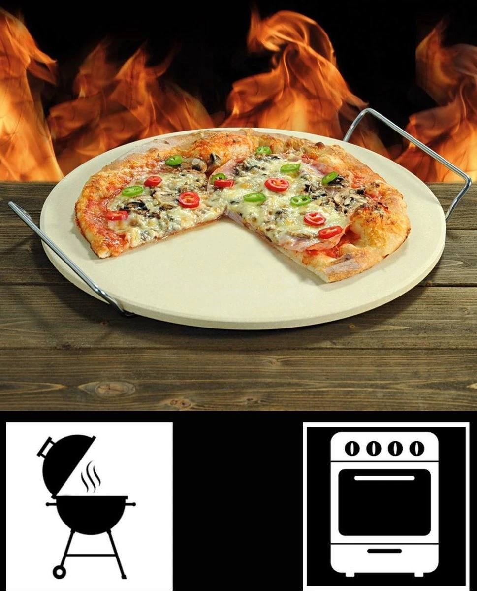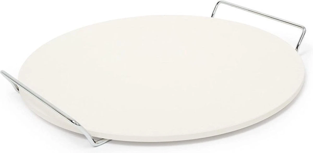 Servez votre pizza sur cette pierre à pizza au moyen du support de service chromé assorti. Ce support est équipé de poignées, de sorte que vous pouvez facilement déplacer cette pierre à pizza sans vous brûler les mains. Il est également possible d’utiliser cette pierre à pizza pour cuire du pain et des biscuits.