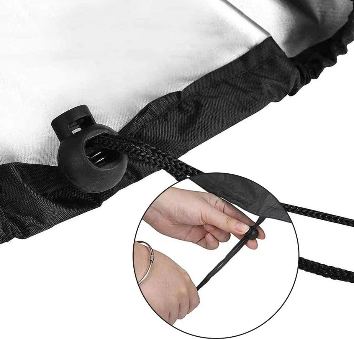 - La conception a été mise à jour. Nous avons cousu des deux côtés pour un design plus stable. Le fil ne coulera pas, une longue durée de vie est attendue. Grâce à des boucles et des fils de haute qualité, vous pouvez également sécuriser le couvercle en cas de tempête ou d’autres conditions météorologiques extrêmes. Le couvercle est facile à nettoyer. Une fois séché après lavage à la main ou en machine, il peut être facilement plié et rangé dans le sac fourni par nous.