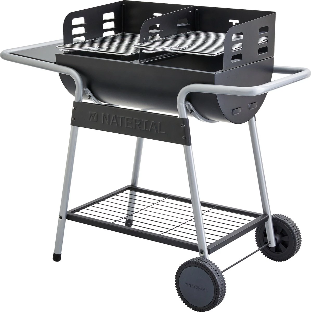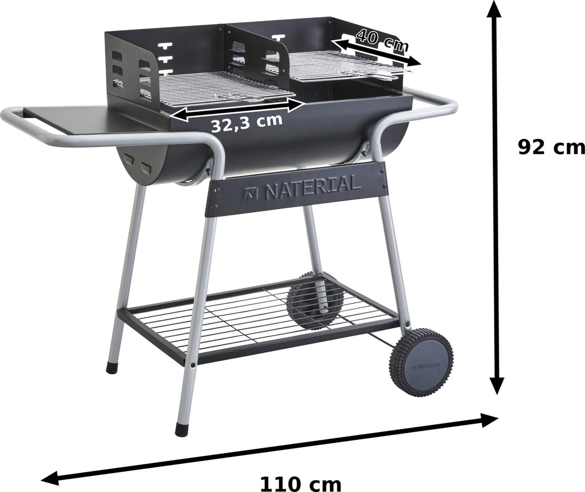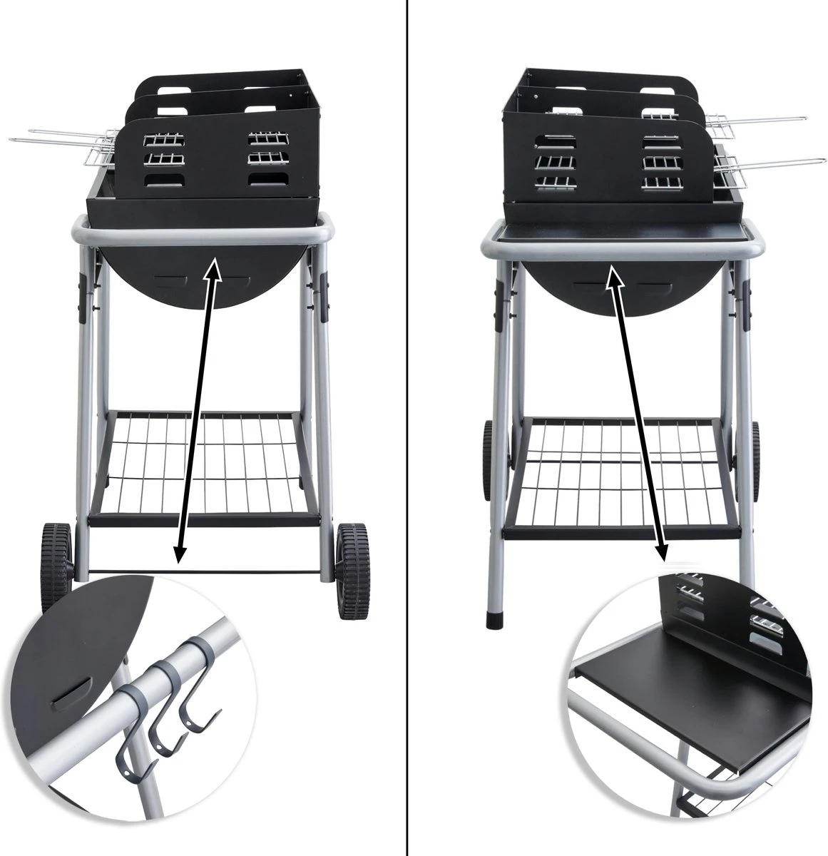 - PRATIQUE : Ce barbecue dispose de deux étagères, une sous le barbecue où vous pourrez ranger le sac à charbon et une étagère latérale avec trois crochets. Ainsi, vous avez toujours tout ce dont vous avez besoin à portée de main. Grâce aux 2 roues et à la poignée, le gril est facile à ranger et à transporter.