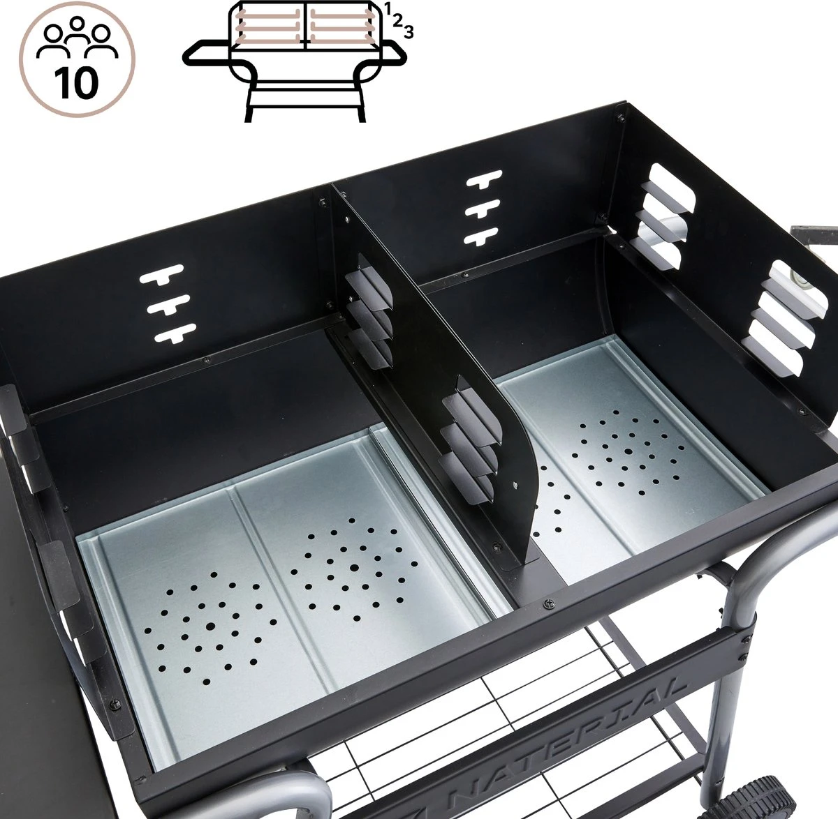 Le gril ICARUS ALPA II facilite la cuisine en plein air, de sorte que vous pouvez facilement préparer un repas pour 10 personnes – parfait pour un repas entre amis ou en famille. Avec ce BBQ , vous avez la garantie que vos aliments seront cuits à la bonne température grâce aux deux zones de cuisson avec grilles de cuisson réglables en hauteur. Ce BBQ est facile à démarrer et possède des évents latéraux et une plaque de feu où vous pouvez placer le charbon de bois tout en permettant à l’air de circuler. Ce BBQ a deux étagères, une sous le BBQ où vous pouvez ranger le sac de charbon de bois et une étagère latérale avec trois crochets. Ainsi, vous avez toujours tout ce dont vous avez besoin à portée de main. Grâce aux 2 roues et à la poignée, il est facile à ranger et à déplacer.