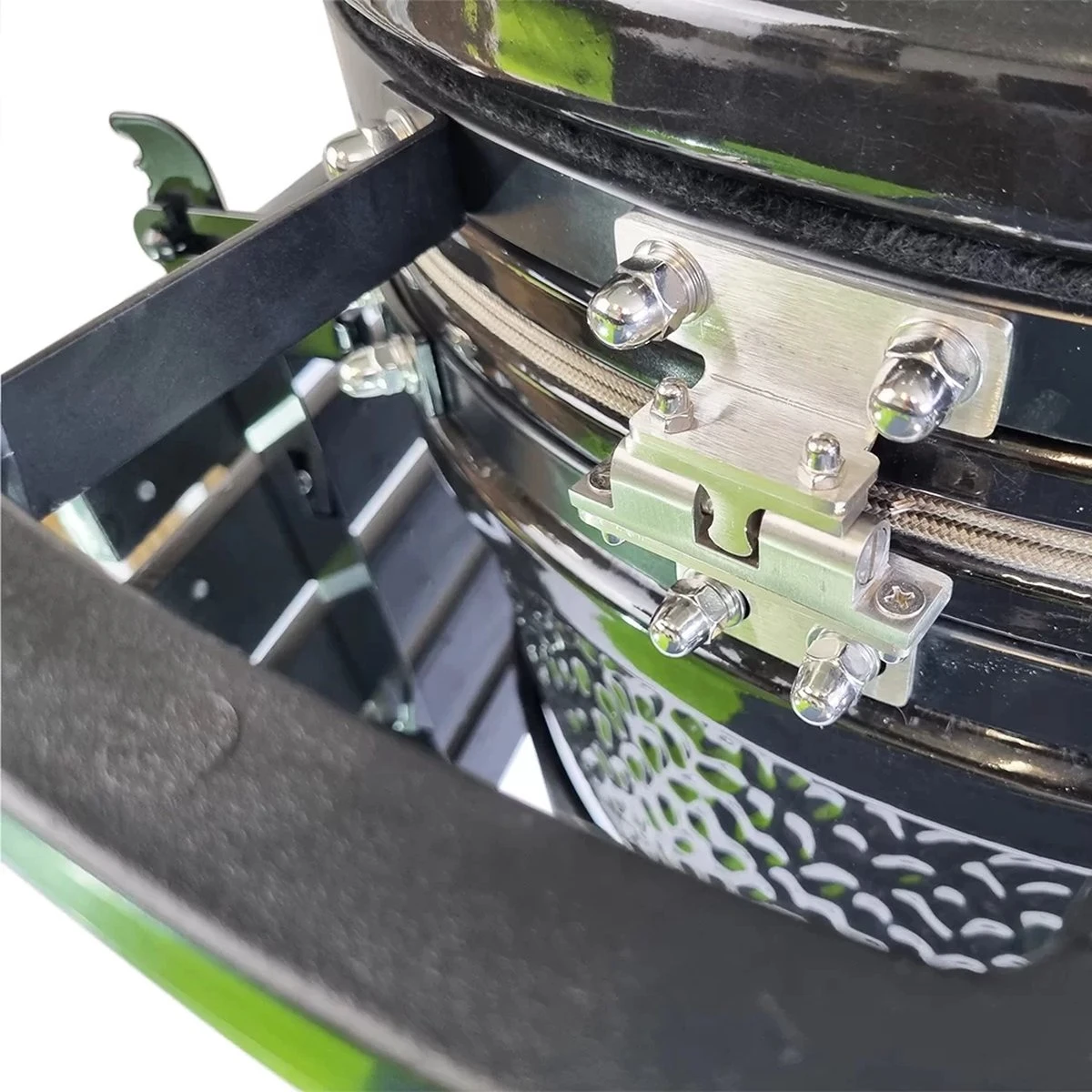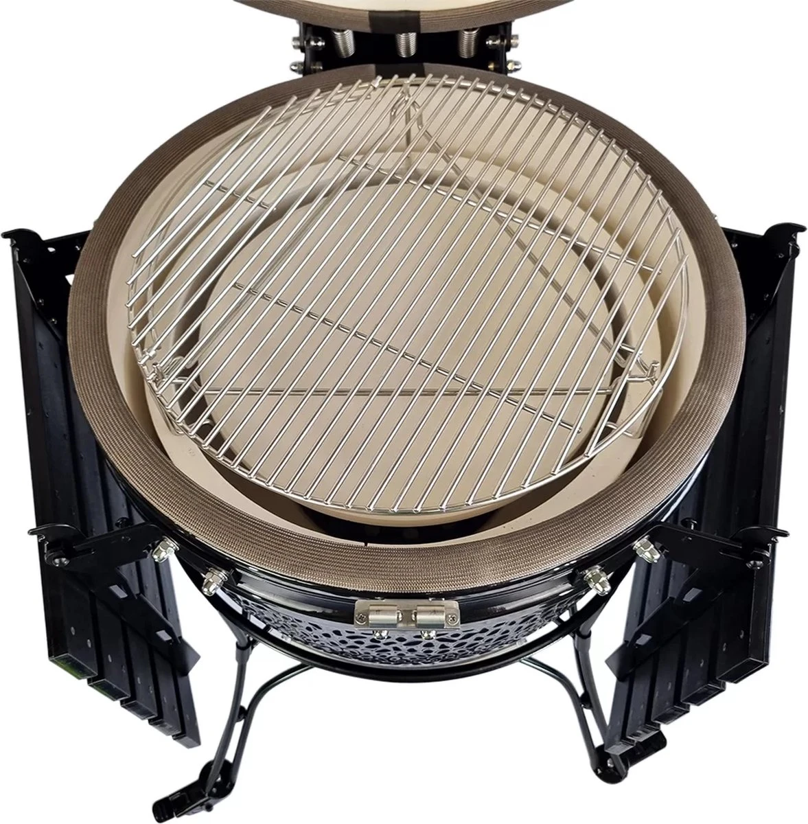 L’Obelix Large 22″ Kamado est le eigen kamado d’Allesvoorkamado ! Ce grand kamado robuste possède une grille de 48 cm de diamètre avec laquelle vous pourrez facilement préparer les plus grosses pièces de viande ou griller jusqu’à 10 personnes ! Il est équipé en standard d’une insoleuse de plaques avec laquelle vous pouvez griller directement et indirectement. L’évent supérieur de précision en aluminium et le double curseur avec grille vous permettent de réguler parfaitement le débit d’air, ceci en combinaison avec le joint en fibre de verre et le mécanisme de verrouillage qui empêche le faux air, fait de l’OBelix un régulateur de température idéal ! Le mécanisme de verrouillage s’ouvre et se ferme automatiquement avec l’ouverture et la fermeture du dôme ! La base de conception garantit que l’Obelix est bien soutenu et qu’il est un véritable accroche-regard !