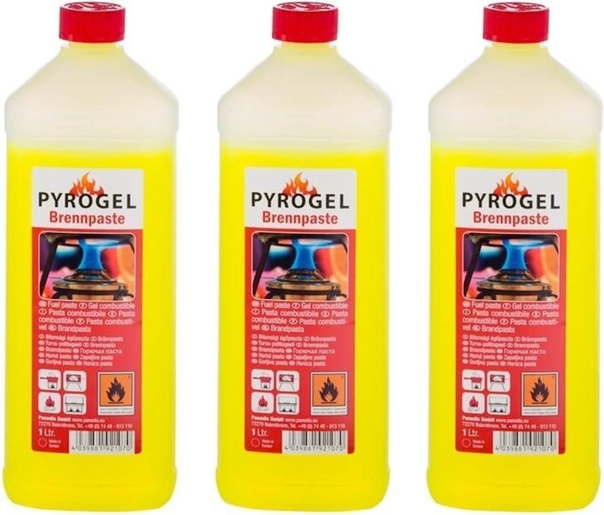 3x Pâte de carburant / bouteille de gel 1 litre. La pâte à carburant est fabriquée à partir d’un alcool naturel. Cela garantit qu’aucune substance nocive n’est libérée pendant la combustion. Idéal pour une utilisation en intérieur. Parce qu’il n’y a pas de vapeurs inflammables, le côté sur les flammes de soufflage est beaucoup moins. Utile pour allumer le barbecue, le foyer ou le feu de camp. Brûlez progressivement. Ne pas utiliser sur une flamme nue. Contenu total: 3 litres. Équipement barbecue / éclairage. Vous recevrez 3 bouteilles de 1 litre. Un total de 3 litres de pâte de carburant.
