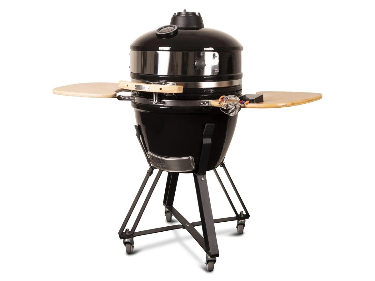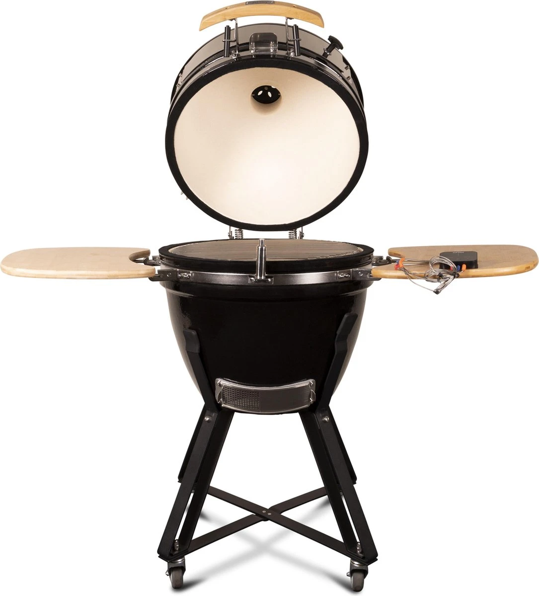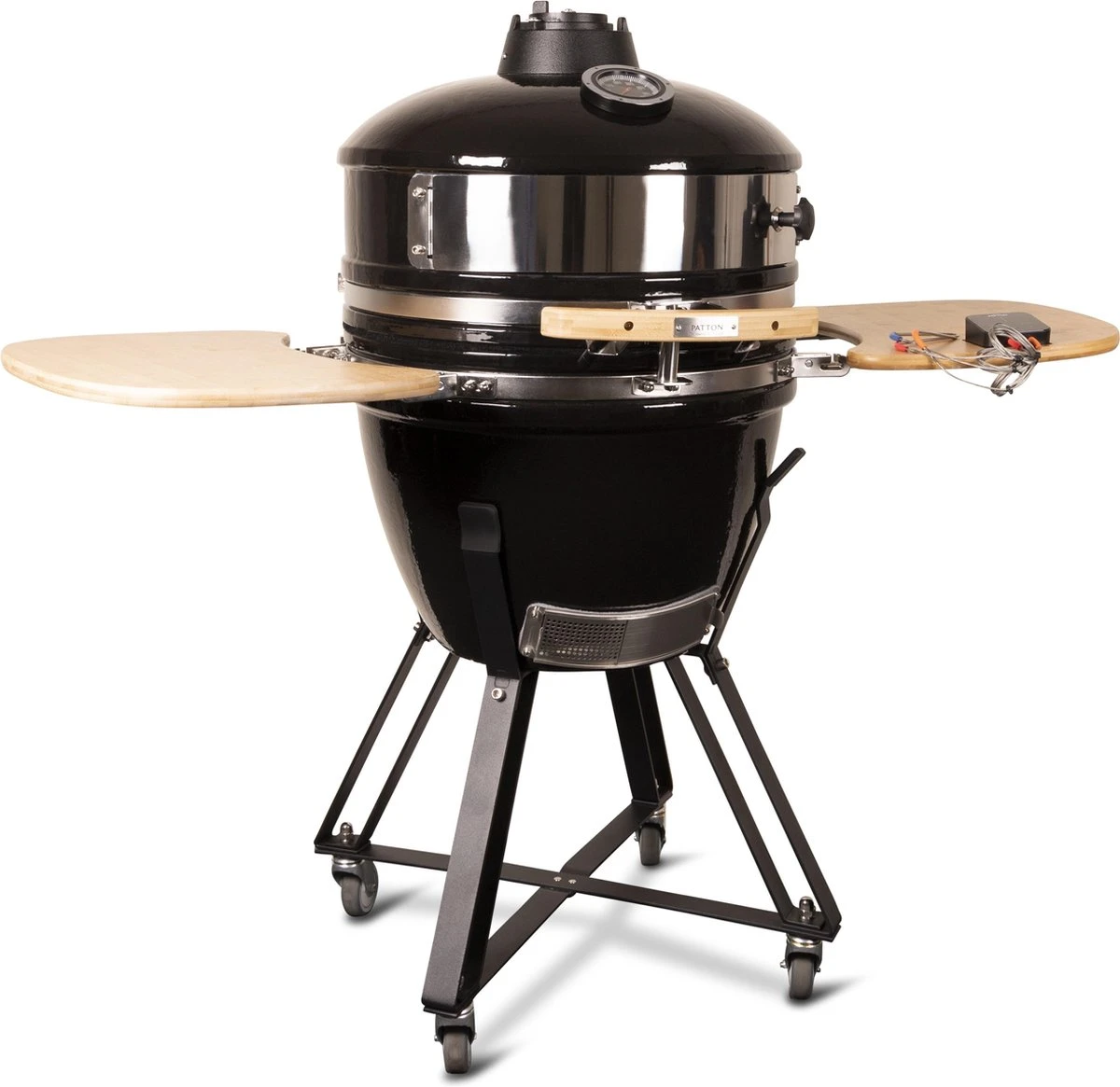 | Contenu de l'emballage | Barbecue en céramique Patton Kamado complet, y compris les tables latérales, la base mobile, le thermomètre à cœur Patton Bluetooth Smart III avec 3 sondes, et 2 x lumières LED pour la poignée, |