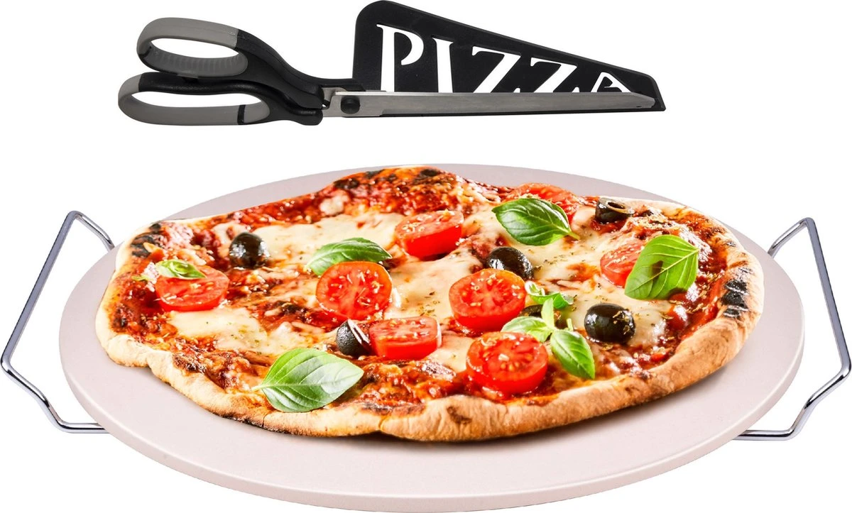 Dimensions : diamètre 33 cm, épaisseur 1,1 cm (4 cm avec anses). Matériel: céramique cordiérite, métal chromé. Va au lave-vaisselle: Non, le lavage à la main est recommandé. Bien sécher avec un torchon. composé de 1x Ciseaux à pizza/pelle noire 30 cm, 1x Pierre à pizza BBQ/four rond en céramique 33 cm avec poignées