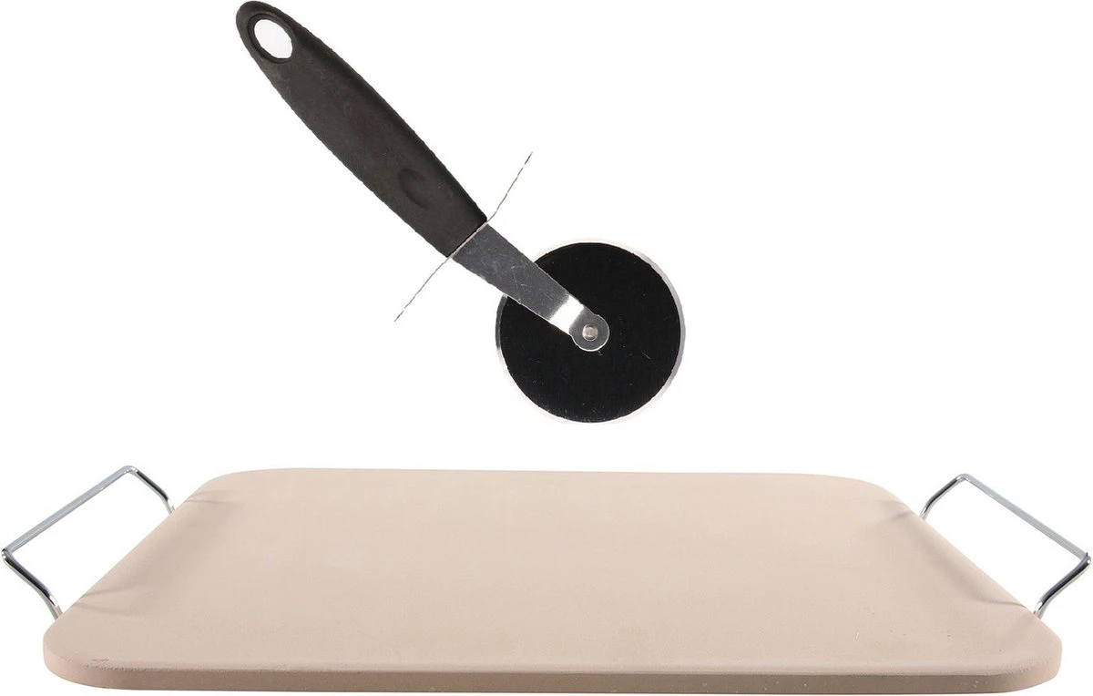 Dimensions : 30 x 38 cm, épaisseur 4 cm. Matière: pierre. Va au lave-vaisselle: Non, le lavage à la main est recommandé. Bien sécher avec un torchon. composé de 1x rouleau à pizza / coupe-pizza 19 cm, 1x pierre à pizza rectangulaire 30 x 38 cm avec poignées