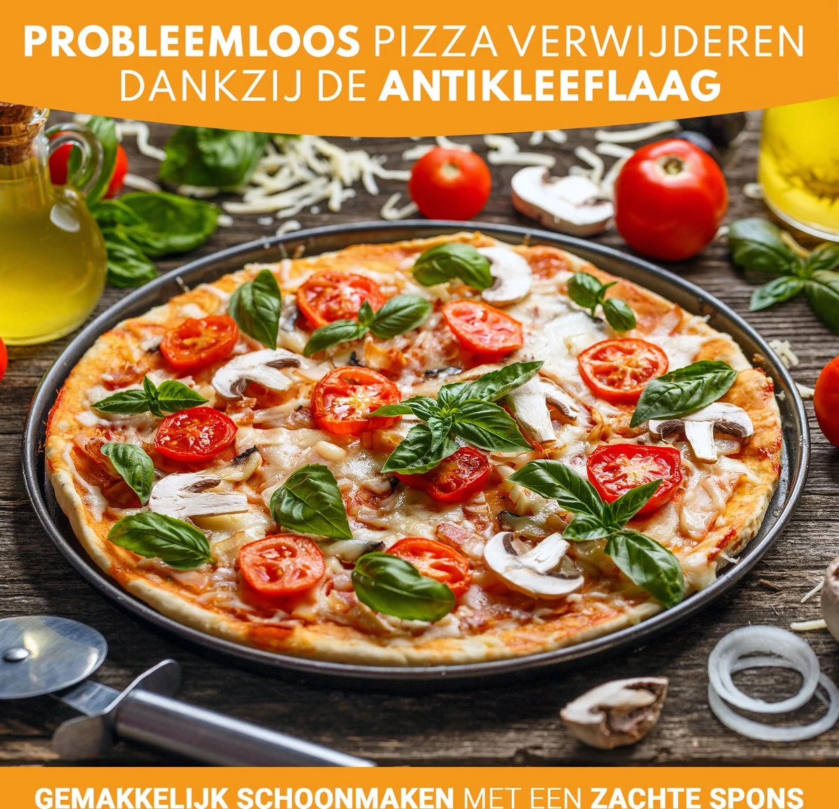 Cette plaque à pizza a un revêtement antiadhésif idéal, qui empêche votre pizza de brûler et vous permet de retirer facilement votre pizza de la plaque. De plus, vous pouvez facilement nettoyer la plaque à pizza après utilisation. Vous utilisez de l’eau tiède et du savon pour cela, la plaque de cuisson n’est pas adaptée au lave-vaisselle.
