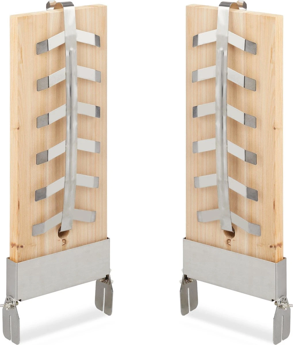 Avec cet ensemble de 2 étagères finlandaises, vous offrez plus de variété sur le barbecue. Les planches de cèdre non traitées sont conçues pour la préparation traditionnelle du saumon. Tout ce que vous avez à faire est de fixer le poisson à la planche de bois avec des pinces en acier inoxydable. Fixez ensuite la planche à saumon au bord du barbecue ou du bol à feu à l’aide des supports. Vous pouvez fixer le support sur 5 niveaux différents, de sorte que la distance parfaite par rapport au feu soit toujours garantie.