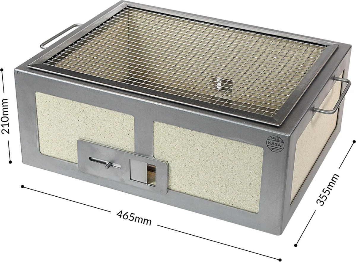 Le gril Kasai Konro a des dimensions de 355 (l) x 465 (l) x 210 (h) mm, ce qui vous permet de déguster des plats parfaits à la maison avec le goût fumé authentique des plats du gril. C’est la taille parfaite pour n’importe quelle surface grâce à sa conception compacte.