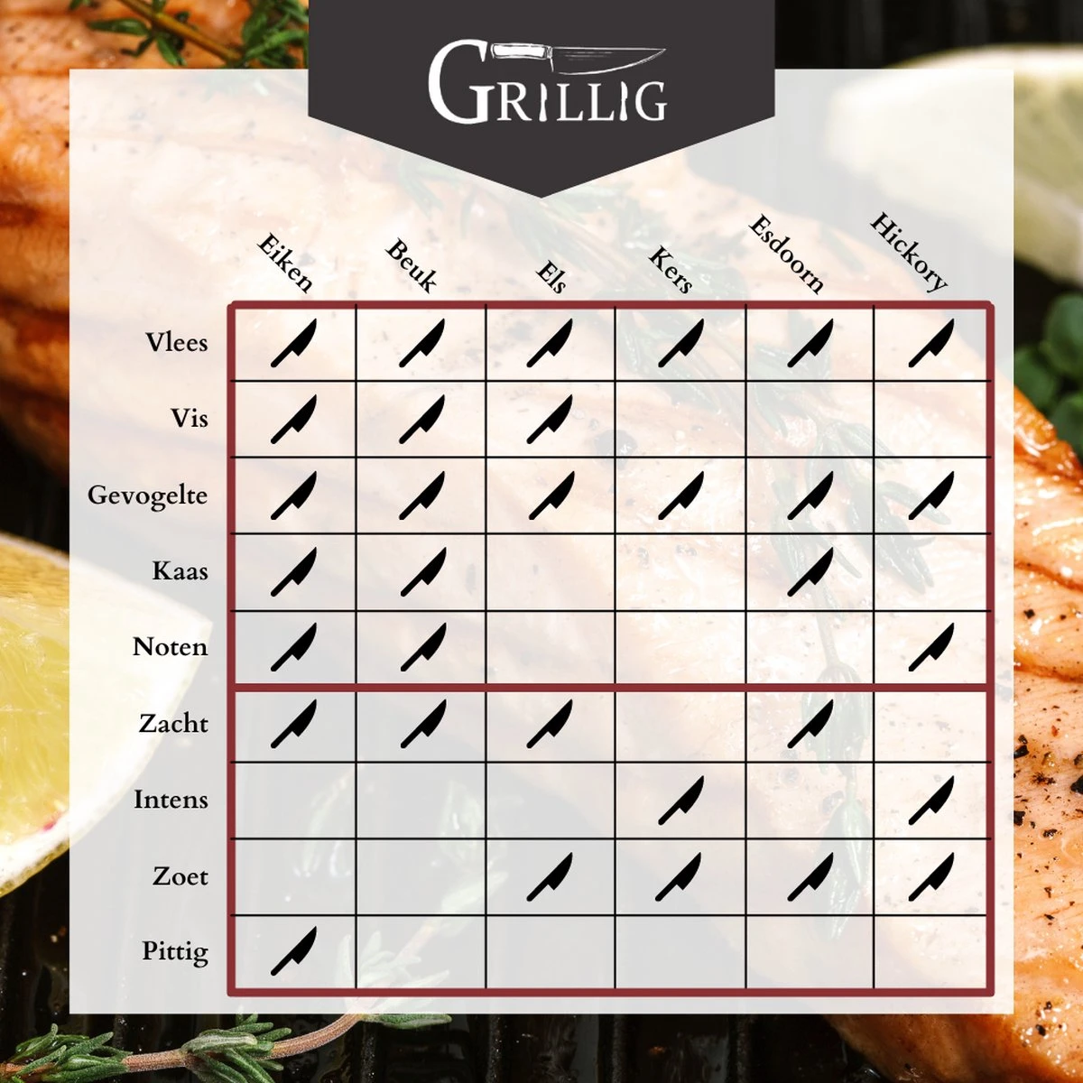 Le bois fumé est ce qui donne du goût à vos produits. Choisissez donc le bois qui voor jou convient le mieux ! (par exemple pomme, hêtre, aulne ou un mélange. Chez Grillig, nous avons une gamme sans cesse croissante de mites de fumée, de copeaux et de morceaux !